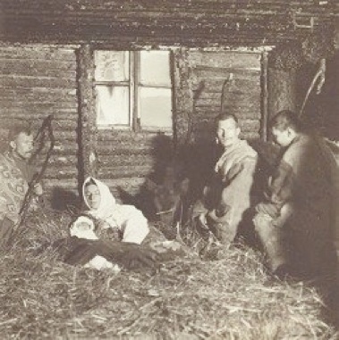 ein Soldat als ‚Maria’ hält das Christkind im Arm