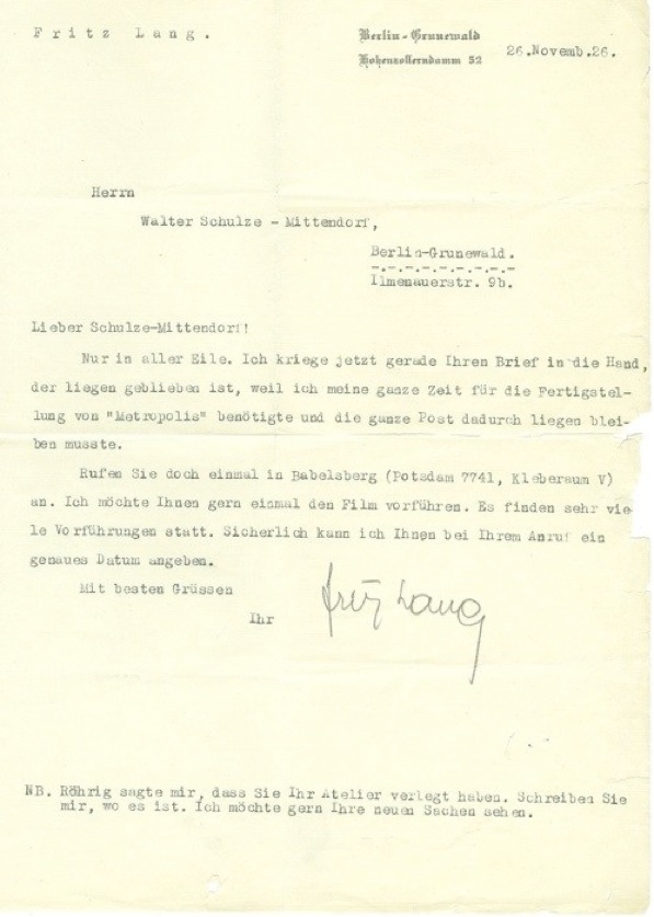 In dieser schriftlichen Einladung vom November 1926, Schulze-Mittendorff ‚Metropolis’ vorab zeigen zu wollen – der Film hat erst am 10. Januar 1927 Premiere –, bekundet Lang nebenbei auch das Interesse an den neuen Arbeiten des Bildhauers: „NB. Röhrig sagte mir, dass Sie Ihr Atelier verlegt haben. Schreiben Sie mir, wo es ist. Ich möchte gern Ihre neuen Sachen sehen.“ Die Frage nach dem Atelier bezieht sich auf Schulze-Mittendorffs neues Atelier in der Bleibtreustraße 7 in Berlin-Charlottenburg.