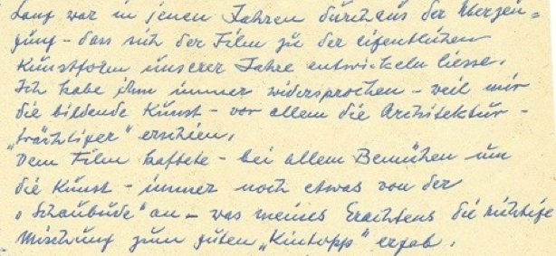 „Mit Lang ergab sich sofort ein ausgezeichneter Kontakt. Wir waren gleichaltrig und alle Beteiligten waren von künstlerischen Ambitionen erfüllt. Lang war in jenen Jahren durchaus der Überzeugung – dass sich der Film zu der eigentlichen Kunstform unserer Jahre entwickeln liesse. Ich habe ihm immer widersprochen – weil mir die Bildende Kunst – vor allem die Architektur – „trächtiger“ erschien. Dem Film haftete – bei allem Bemühen um Kunst immer noch etwas von der „Schaubude“ an – was meines Erachtens die richtige Mischung zum guten „Kintopp“ ergab.“