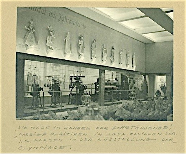 „Die Mode im Wandel der Jahrtausende“, farbige Plastiken im AGFA Pavillon der I.G. Farben in der Ausstellung der Olympiade.