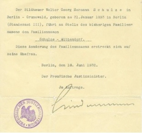 Walter Schulze-Mittendorff durchschaut die Nazis und deren Vorhaben, das versetzt ihn in die Lage, den ersten Schritt zu tun. 1932 lässt er seinen bereits 12 Jahre inoffiziell geführten Doppelnamen behördlich eintragen. Dazu mag ihn die Überlegung motiviert haben, dass bei einer Gefangennahme seiner Frau der Name ‚Schulze’ zu anonym wäre, da er zu den häufigsten Namen zählt. Den Ort einer Verwahrung herauszufinden ist einfacher, wenn der Name der Gefangenen selten und auffällig ist.
